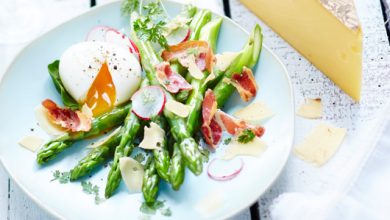 Asperges vertes aux œufs mollets, chips de pancetta et copeaux de Vacherin® Fribourgeois AOP