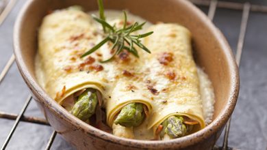 Cannellonis d’asperges vertes et blanches et jambon fumé