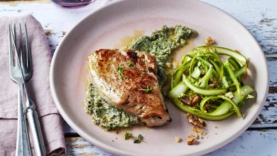 Suprême de pintade fermière Label Rouge asperges vertes au lard fumé, vinaigrette balsamique, noisettes et câpres