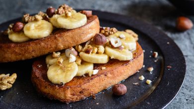 Gaufres aux figues fraîches, chips de bananes, fruits rouges et noisettes toastées