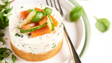 Cheesecake au saumon, smoothie avocat et concombre au basilic