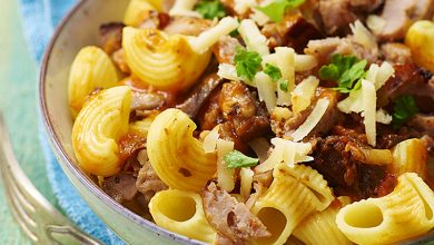 Les Coudes rayés aux aubergines confites, Beaufort et saucisse de Toulouse