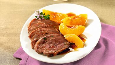 Filet de canard et pêches tièdes, caramel au beurre salé
