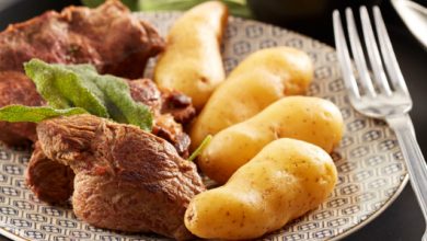 Rôti de bœuf glacé au beurre au thym et pommes grenailles