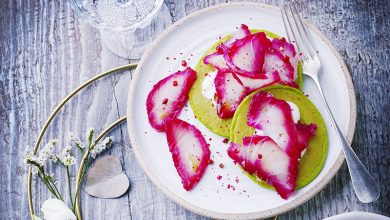 Mini blinis à la crème de pistache, saumon fumé & grenade
