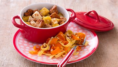 Cassolettes de veau aux pommes et à la féta, poêlée de tagliatelles et de carottes en ribambelle