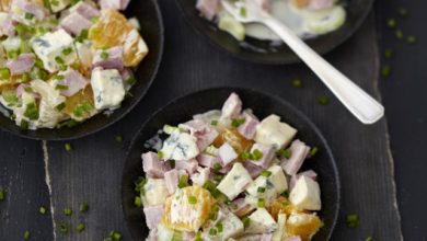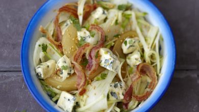 Salade de fenouil croquant au Bresse Bleu, poire et pancetta croustillante