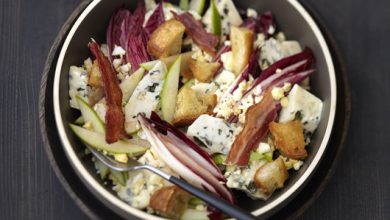 Salade d’endives rouges au Bresse Bleu, œufs durs et chips de lard
