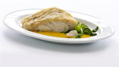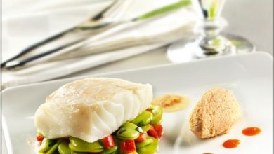 Dos de Cabillaud Poché au Lait, Salade de Févettes, Poivron Confit et Lait Brûlé