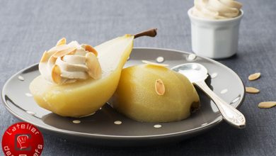 Poires confites au café-calva et chantilly au café