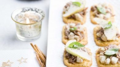 Canapés de pain d’épice, Fourme d’Ambert, chutney de dattes