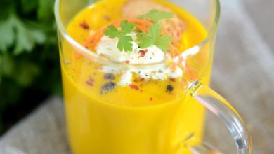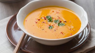Soupe carottes & orange au cumin, feuilletés au sésame & cumin, baies roses