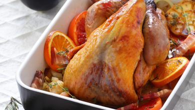 Pintade Fermière Label Rouge à l’écrasé de carottes, aux agrumes et au lard