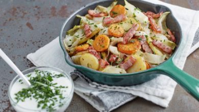 Poêlée hivernale aux pommes de terre, lardons, carottes, endives, crème aux fines herbes