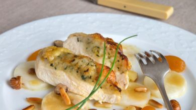 Volaille croustillante, céleri confit, fruits secs et Comté