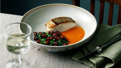 Skrei rôti sauce aux poivrons, chorizo et olives
