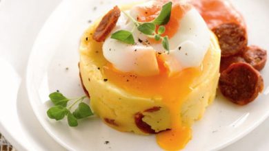 Œuf poché, purée de pommes de terre au chorizo et coulis de tomate