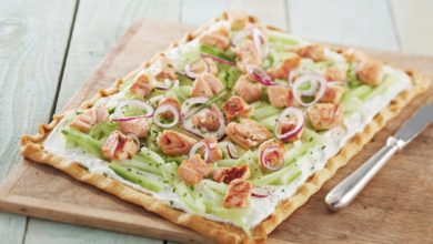 Tarte fine fromage frais, saumon, concombre & ciboulette
