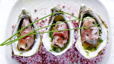 Huîtres snackées au Jambon de Bayonne Aoste, sauce vierge de ciboulette à l’huile de truffe