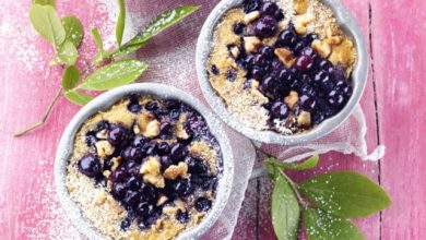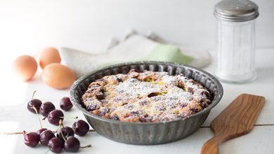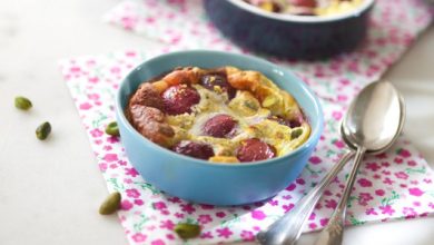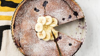 Clafoutis au lait de coco, à la banane et aux myrtilles