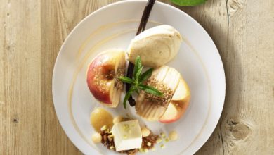 Pomme rôtie au cœur croquant, mousse lactée sur crumble et compotée