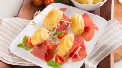 Mini‐brochettes de madeleines aux graines de pavot accompagnées de Jambon de Parme, tomates et basilic