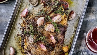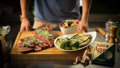 Côte de bœuf grillée à la fleur de sel, champignons de Paris et petites rattes grillées au persil et à l’ail, vinaigrette à la noisette