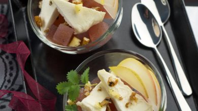 Gelée de poire au vin, Boursault et crumble de crackers japonais