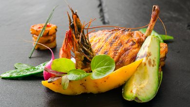Pintade exotique mangue avocat et crevettes grillées