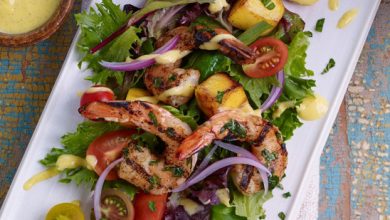 Salade tandoori, crevettes grillées et vinaigrette à la mangue