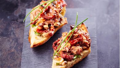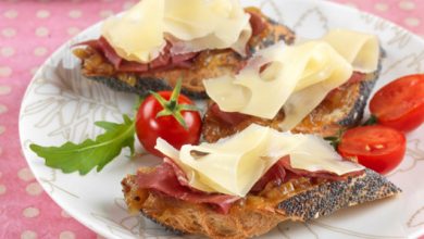 Crostinis à l’Emmental de Savoie, chutney d’oignons « maison » et émincé de Brésaola