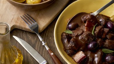 Sauté de bœuf aux olives et palets de pommes de terre croustillants