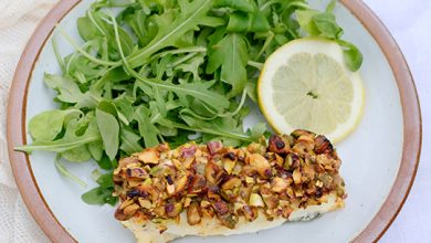 Filet de carrelet en croûte de pistaches, brocoli et chou romanesco rôtis au four