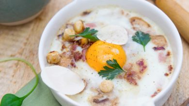 Œuf au plat, champignons de Paris, jaune aux éclats de noisettes