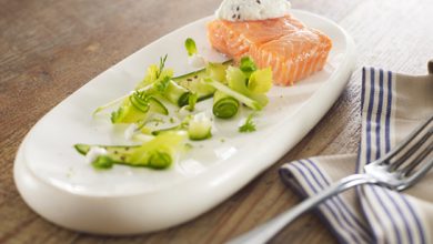 Saumon mi-cuit, concombre au vinaigre de riz et Faisselle Rians au sésame grillé