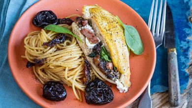Suprêmes de volaille farcis aux épinards et aux Pruneaux d’Agen IGP, spaghettis au jus de volaille