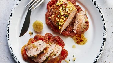 Pavé de veau rôti, jus de citron confit et thym, tomate cœur de bœuf poêlée à la farine de pois chiche