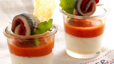Flan de Pur Brebis Pyrénées, gaspacho et roulés de sardines aux piquillos