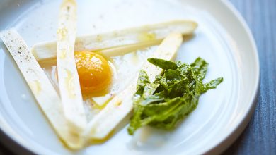 Eau des salines de Guérande, asperges blanches à cru, jaune d’œufs maturés & fleur de sel Le Guérandais