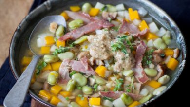 Bûcheronne (« minestrone de la forêt » avec pesto brun de champignons, châtaignes et fèves, légumes d’hiver, lard)