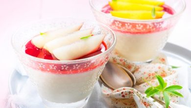 Panna cotta de St Môret® à l’anis vert, pêche et coulis de framboises