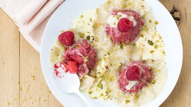 Cornets croustillants au St Môret® Réduit en Sel, pistaches et framboises