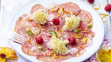 Carpaccio de bœuf, radis roses et framboises à la Tête de Moine AOP, vinaigrette aux agrumes et tagète mandarine