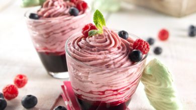 Mousse de framboises sur une gelée de cassis à la violette, meringue mentholée