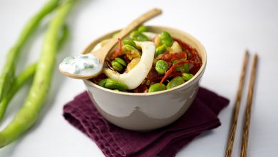 Wok de calamars, poêlée de fèves et fromage blanc aillé