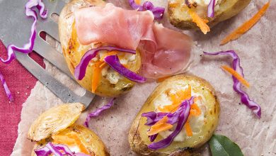 Pommes de terre au four farcies à la crème de fromage, Jambon de Parme et julienne de légumes
