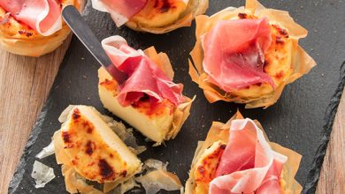 Tartelettes de pâte filo à la semoule, au fromage et au jambon de Parme