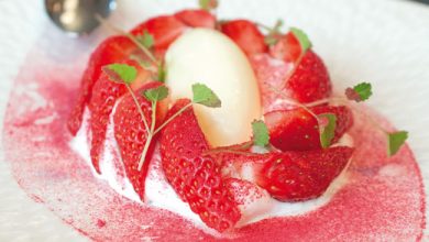Bavarois aux fraises avec salade de fruits frais et glace au yaourt