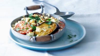 Gratin d’aubergines farcies à la brousse et pignons de pin, pulpe fine de tomates et parmesan