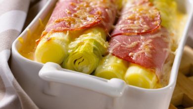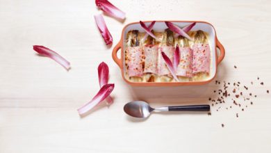 Endives braisées au miel, roulées au jambon et plumes d’endives